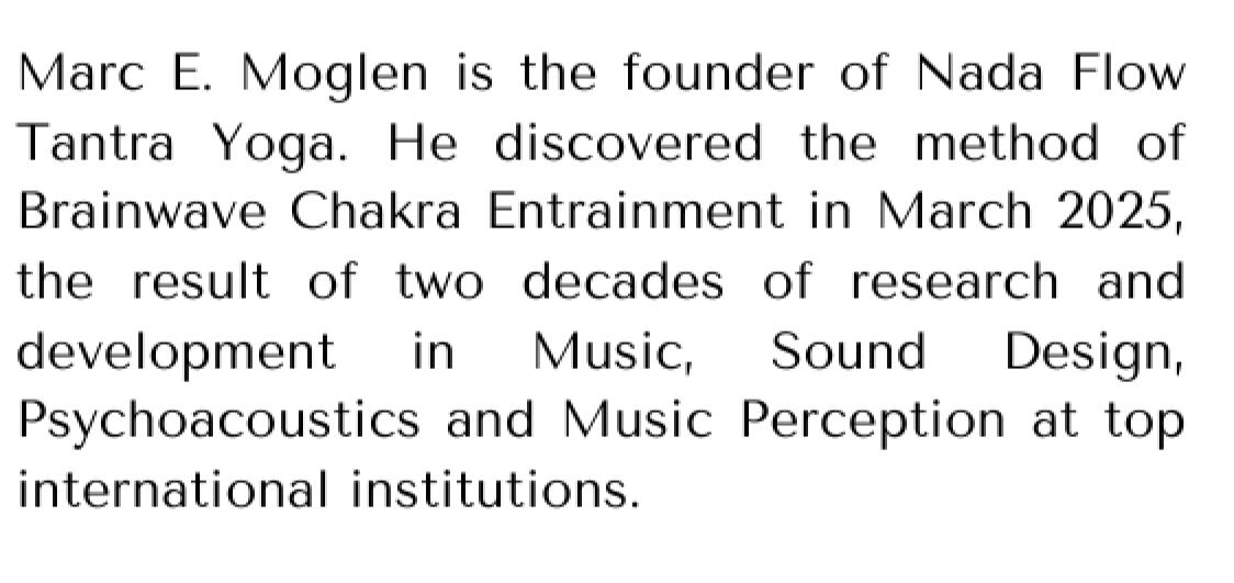 Marc E. Moglen is the founder of Nada Flow Tantra Yoga. He discovered the method of Brainwave Chakra Entrainment in March 2025, the result of two decades of research and development in Music, Sound Design, Psychoacoustics and Music Perception at top international institutions.